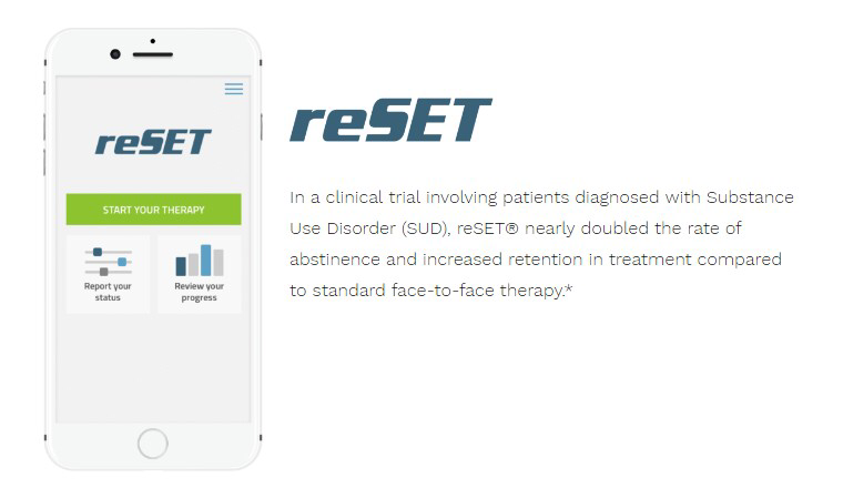 최초의 디지털 치료제는 중독 치료 목적의 애플리케이션인 리셋(reSET)이다. 알코올, 코카인, 대마초 등의 중독과 의존성을 치료하기 위해 의사의 처방을 받아 사용할 수 있는 애플리케이션이며 외래 환자를 대상으로 기존의 치료 프로그램에 더해 12주 동안 사용한다. 물질에 대한 중독을 완화하고 치료 프로그램에 대한 순응도를 높이는 것이 주사용 목적이다. 리셋은 중독을 치료할 수 있는 방법 중 하나인 인지행동치료를 제공하는 앱이다. 즉, 자신이 약물을 사용하는 상황과 요인을 파악하고, 충동적인 행동을 하게 될 때 대처법이나 사고방식의 변화 방법 등을 이 앱을 통해서 훈련하며, 자신의 상태나 약물의 사용에 대해서도 기록할 수 있다. 리셋은 이러한 행동 치료를 텍스트, 비디오, 애니메이션, 그래픽 등의 콘텐츠를 통해 제공한다.