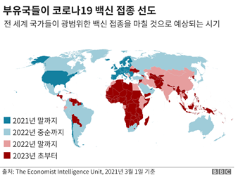 현재 백신 기술은 미국, 러시아 같은 상대적 부유국에서 주를 잡고 있다. 우리나라에 도입되기를 기다리는 백신인 화이자, 모더나 역시 미국에서 개발된 백신이다. 미국은 전체 인구의 약 20%가 코로나 19 백신 접종을 완료하였고, 미국 내에서 백신 공급 속도는 증가하고 있지만, 백신강국과 빈곤국 사이 격차는 점점 벌어지고 있다.다음 그림은 전 세계 국가들이 광범위한 백신 접종을 마칠 것으로 예상되는 시기를 나타낸 것이다. 부유한 국가를 제외한 대부분 나라에서는 2022년이 되어서야 일정량의 백신 접종이 가능할 것으로 예측하고 있다.