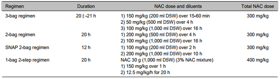 NAC는 경구투여와 정맥투여가 모두 가능하지만 두 방식의 효과가 유사하므로 치료 기간이 짧은 정맥투여가 선호된다. 전통적인 NAC 정맥투여 방법은 바로 '3-bag regimen'이다. 이는 1977년에 제안된 것으로, 3차례에 걸쳐 20시간 15분 동안 총 300mg/kg의 NAC를 투여하는 방법이다(150mg/kg 15분, 50mg/kg 4시간, 100mg/kg 16시간). 하지만 안타깝게도 이는 각 단계마다 서로 다른 농도를 정맥투여하는 방식이었기에, 각기 다른 농도 및 주입속도로 발생하는 투약 오류와 긴 평균 재원일수 (average length of stay, ALOS)가 단점으로 지적되었다. 따라서 이를 보완하기 위해 2-bag regimen, SNAP 2-bag regimen, 1-bag 2-step regimen 등 다양한 방법들이 시도되었다.