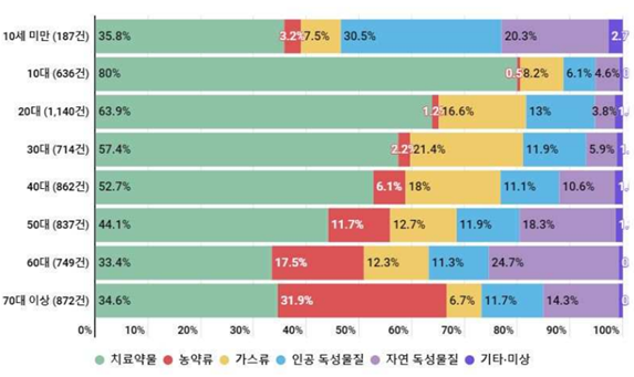 지난 27일 질병관리청이 공개한 '응급실 기반 중독 심층 실태조사(22.6.~23.5.)' 1차년도 결과에 따르면 중독 환자 중 51.5%가 치료약물에 의한 중독으로 나타났다. 게다가 10대 중독 환자 중 80%가 치료약물에 의한 중독으로, 10대가 치료약물 중독에 가장 취약한 집단으로 나타났다. 이들이 중독된 약물로는 아세트아미노펜 계열 해열제가 21.1%, 벤조다이아제핀 계열 신경안정제가 19.2%로 가장 많았다.
