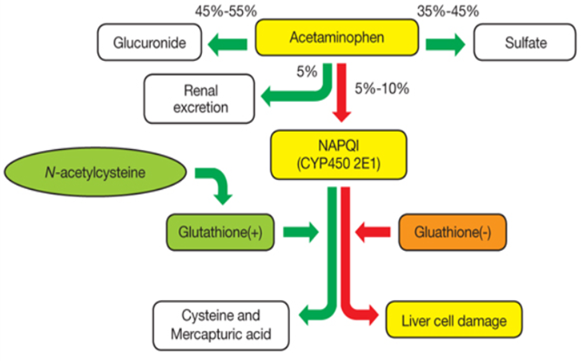 아세트아미노펜을 치료 용량대로 복용할 경우, 90%는 간에서 sulfate 및 glucuronide 화합물로 대사 되어 소변으로 배출된다. 그리고 나머지(10%)의 절반 정도는 cytochrome P450 산화효소에 의해 대사 되어 독성물질인 'N-acetyl-p-benzoquinoneimine(NAPQI)'을 생성한다. 적은 양의 NAPQI는 간의 글루타티온(glutathione, GSH)과 빠르게 반응하여 무독성 화합물을 생성하고 이는 소변으로 배출된다.